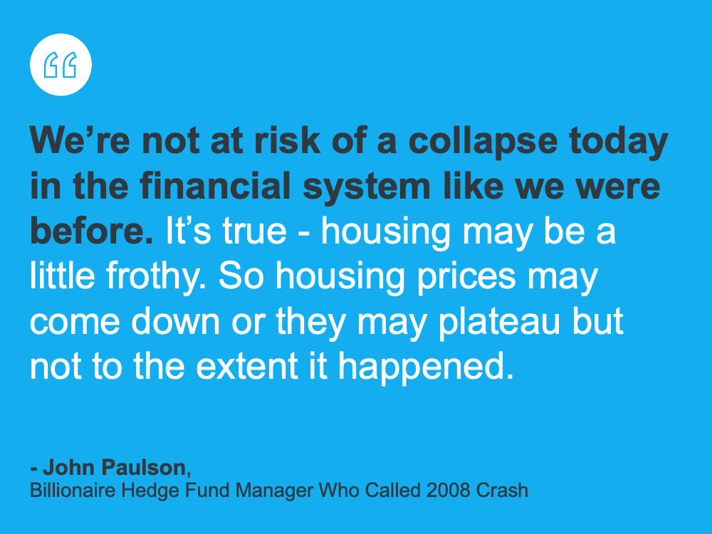 John Paulson, a hedge fund manager who correctly predicted the housing market crash of 2008 doesn’t see a repeat this time around;