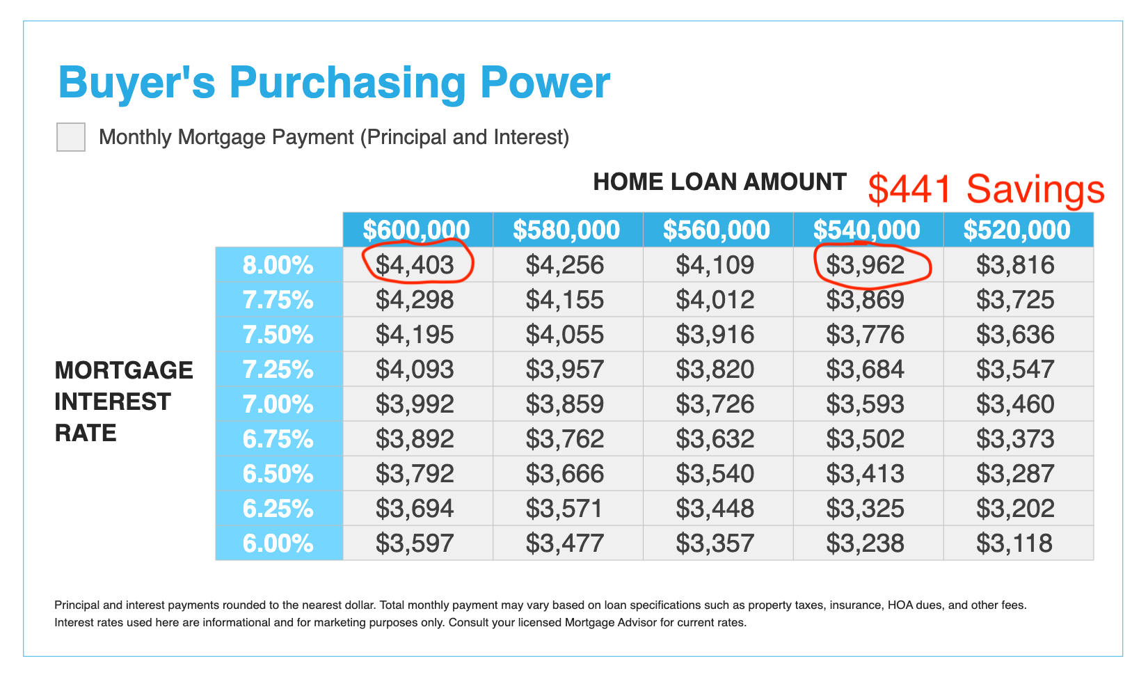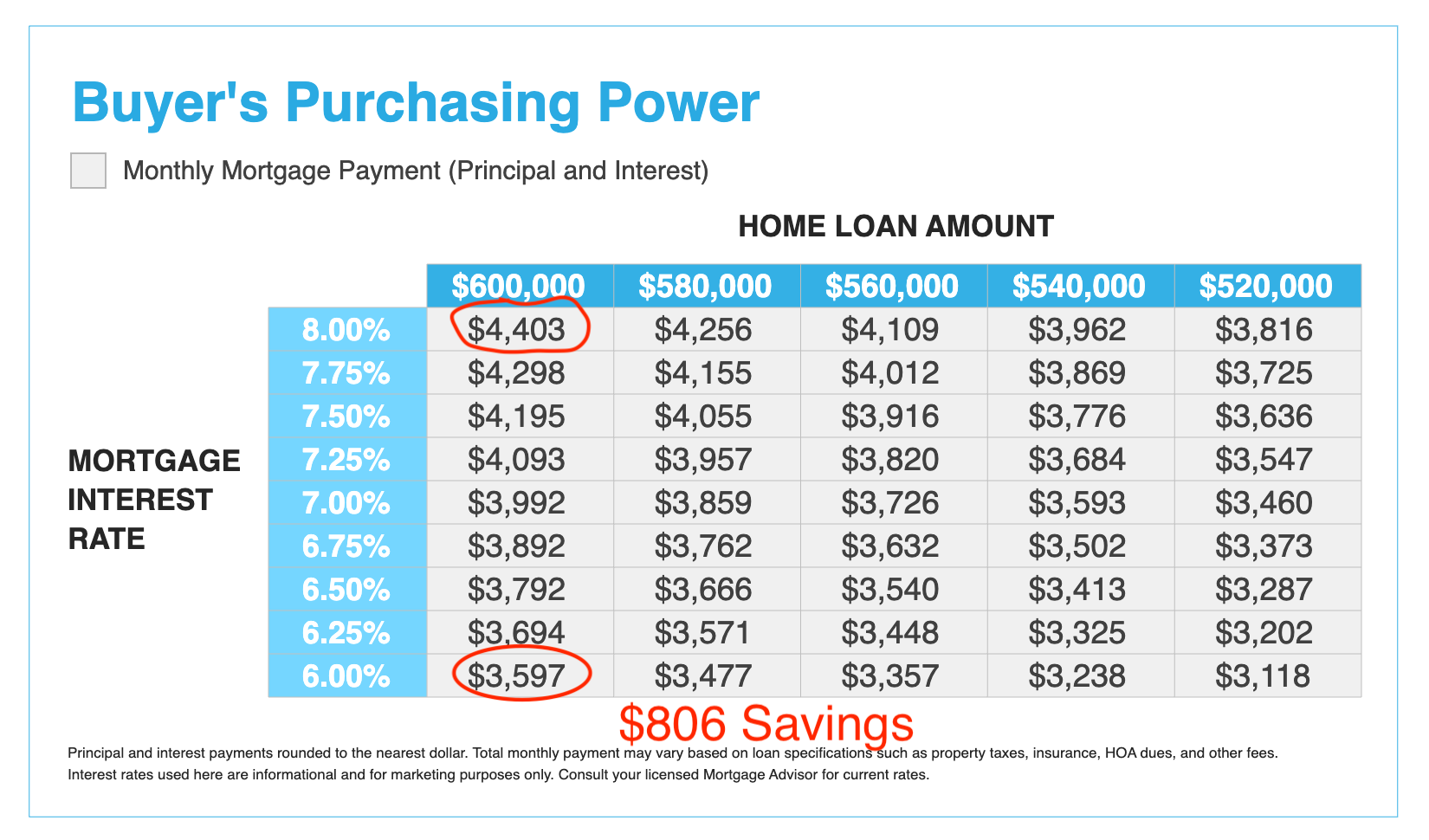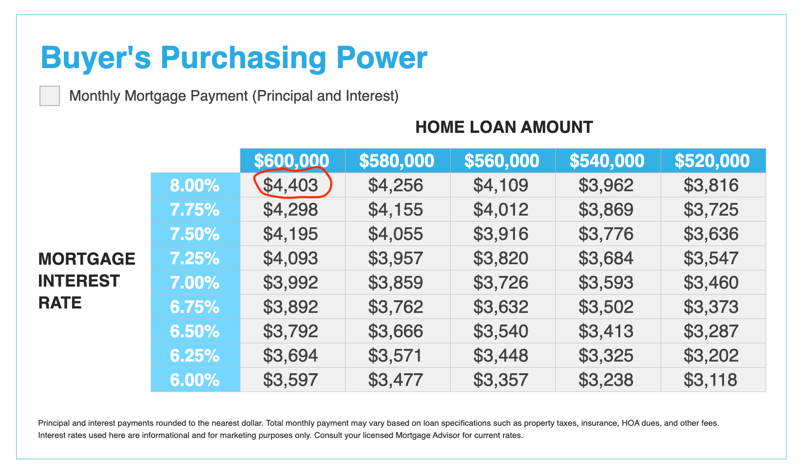 The following chart shows the impact both mortgage rates and home prices have on your monthly mortgage payment. Using a $600,000 loan amount and a mortgage rate of 8%, I’ve circled the monthly principal and interest payment.