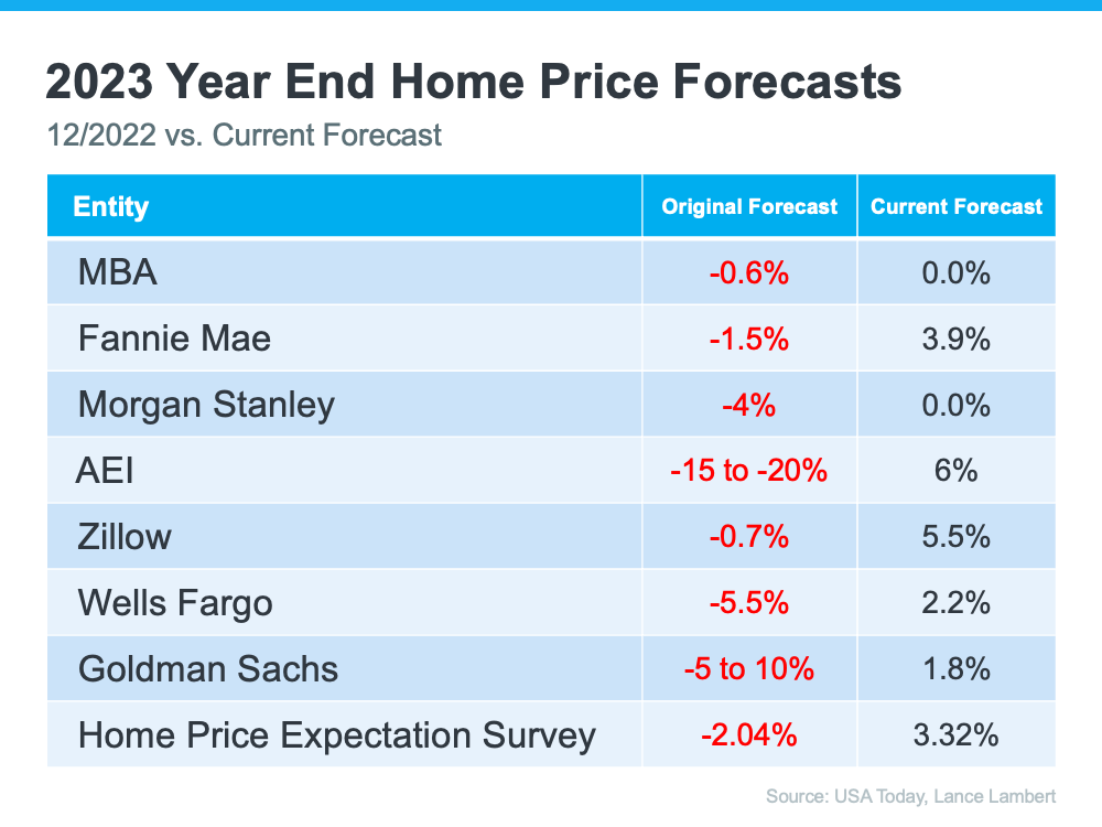 As you can see, we went from forecasts of home prices decreasing anywhere from 0.6% to 20% in 2023, to forecasts that home prices will actually end the year up anywhere between 0% and 6%.