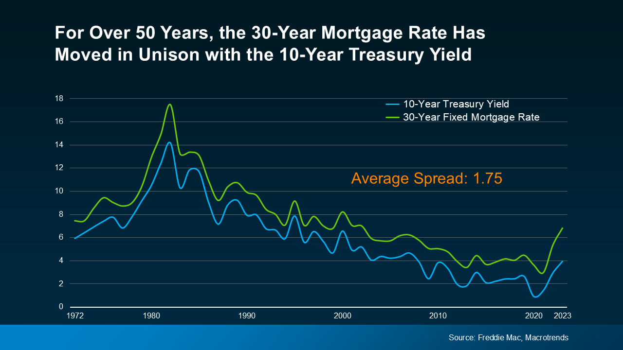 Here’s a visual of how these two rates mirror each other over time. The more uncertainty in the market, the greater the spread between them, and this helps explain why mortgage rates have been slower to fall.