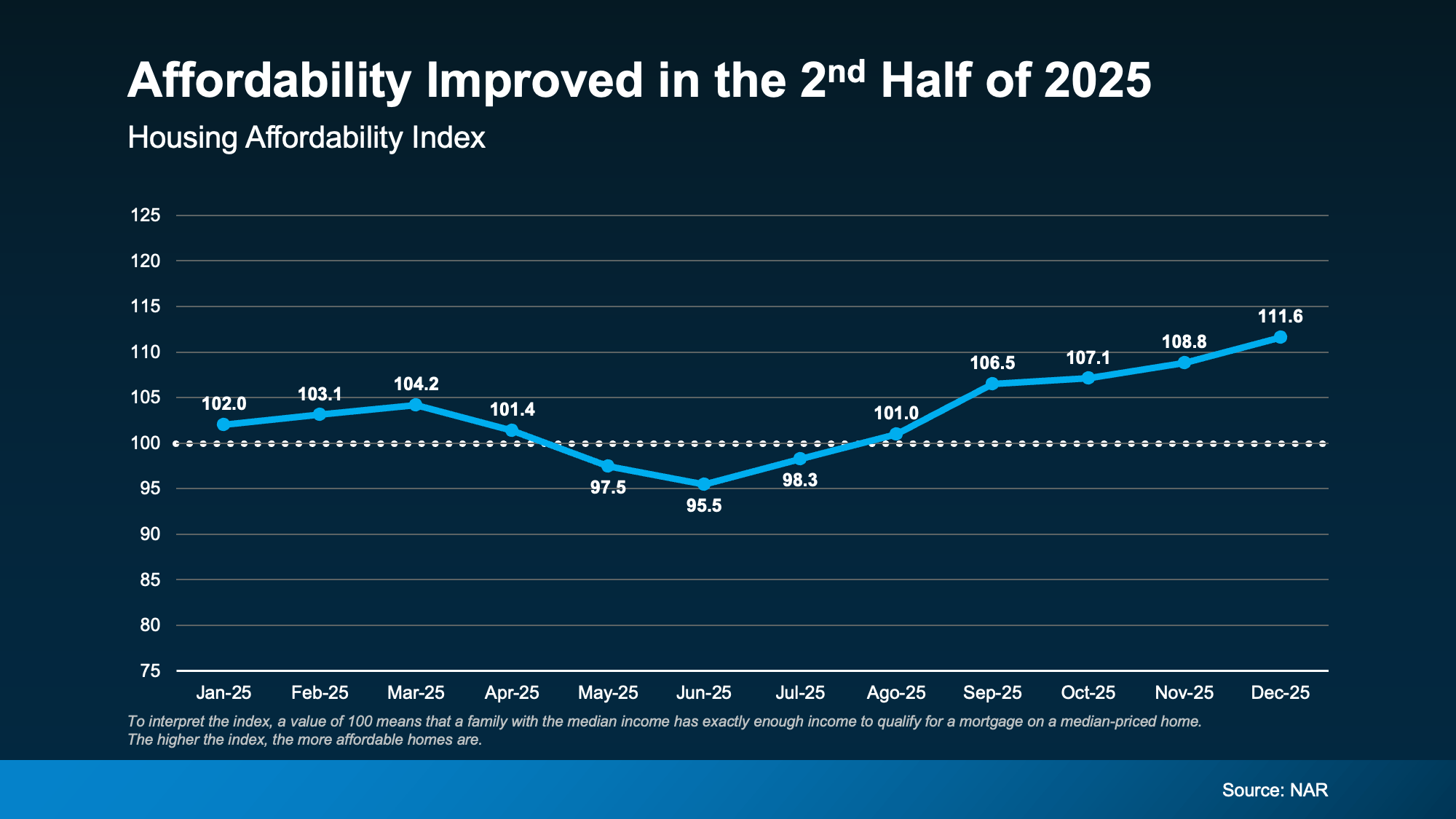 The higher the affordability index climbs, the more affordable housing is considered. After bottoming out in mid-2025, affordability has been steadily improving.